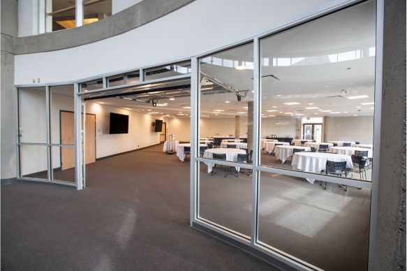 This beautifully modernized space features flexible lighting options, an enhanced sound system, and dual 80” LCD screens—creating a professional, polished setting for any event. A versatile garage‑style door opens into the Rotunda, offering a seamless indoor‑to‑indoor flow that elevates guest experience. Wall‑to‑wall windows fill the room with natural light and showcase scenic views of the TRU Campus Commons. Ideal for social gatherings, intimate conferences, presentations, meetings, and weddings, this venue adapts effortlessly to meet your event needs.